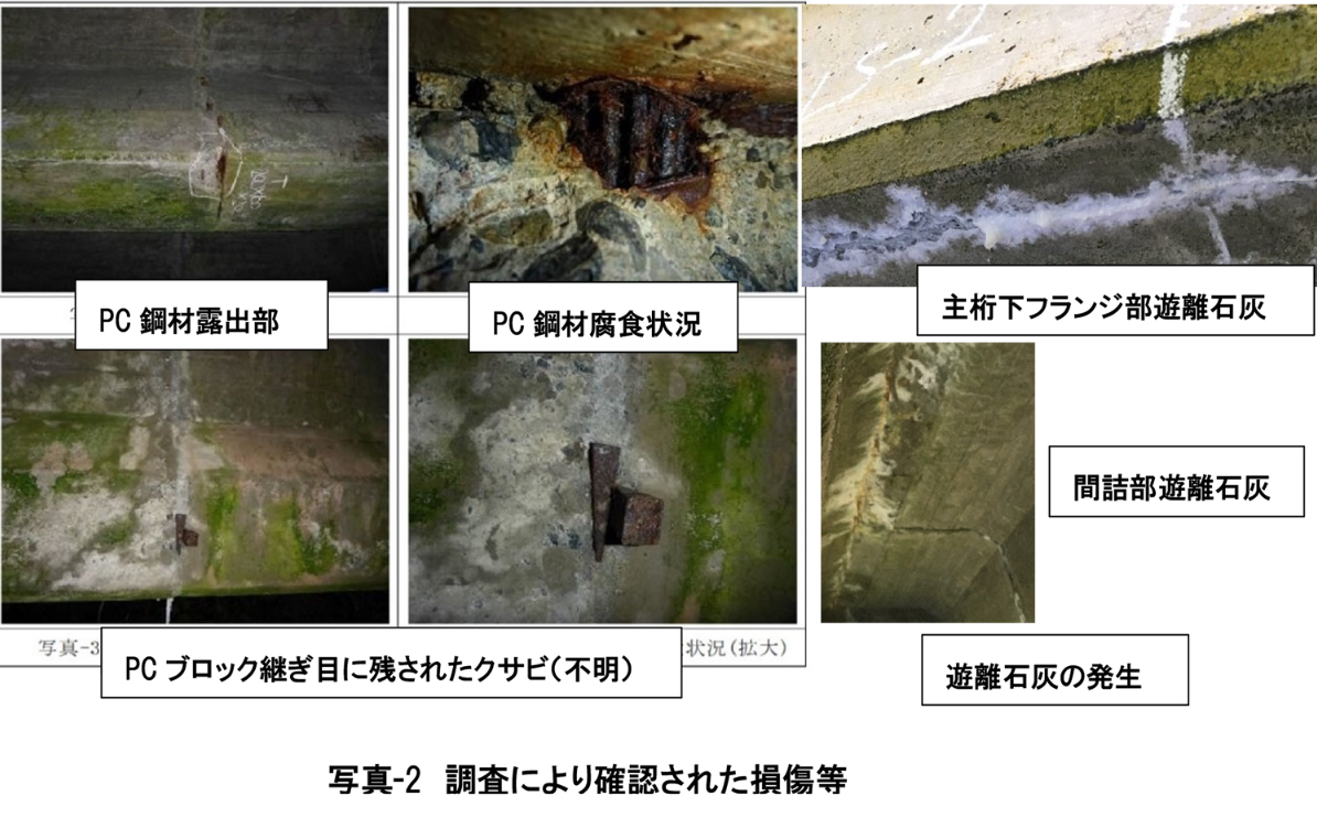 - 当該橋梁では、PC鋼材の露出・腐食・グラウト充填不良、遊離石灰、等の損傷が確認されたことにより大型車の通行規制が実施されていた。今後の供用を行う上での補修・補強や架け替えの必要性を判断するための耐荷力を確認するため載荷試験を実施することとなった。耐荷力評価の手法としては、荷重車載荷によるひずみ計測が実施された。