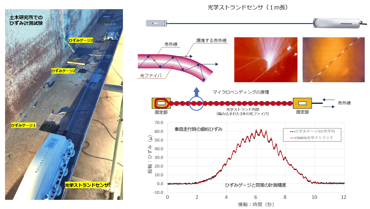 光ファイバを用いた光学ストランドセンサは、従来のひずみゲージと比べ、設置施工が容易で、耐久性があるため長期モニタリングに適しています。